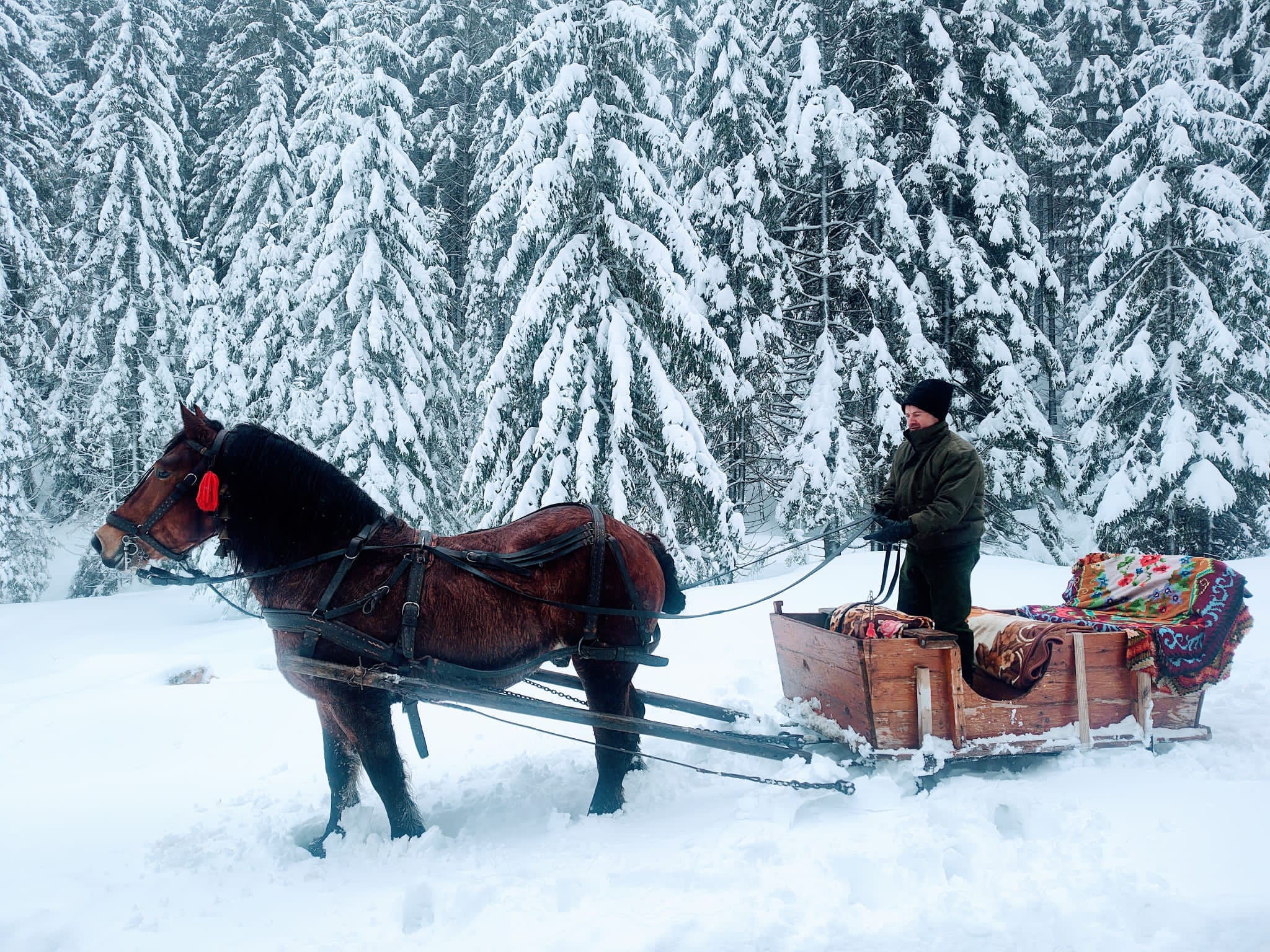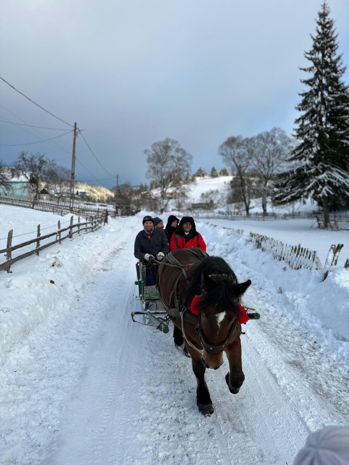 Caii înainteză domol, clinchetul zurgălăilor taie aerul rece, iar zăpada scrâșnește sub tălpile saniei. În jurul tău, casele răsfirate, fumul care se ridică leneș din coșuri, brazii încărcați și munții care te însoțesc în tăcere creează exact genul acela de atmosferă după care tânjești tot anul: autentică, curată, fără grabă.